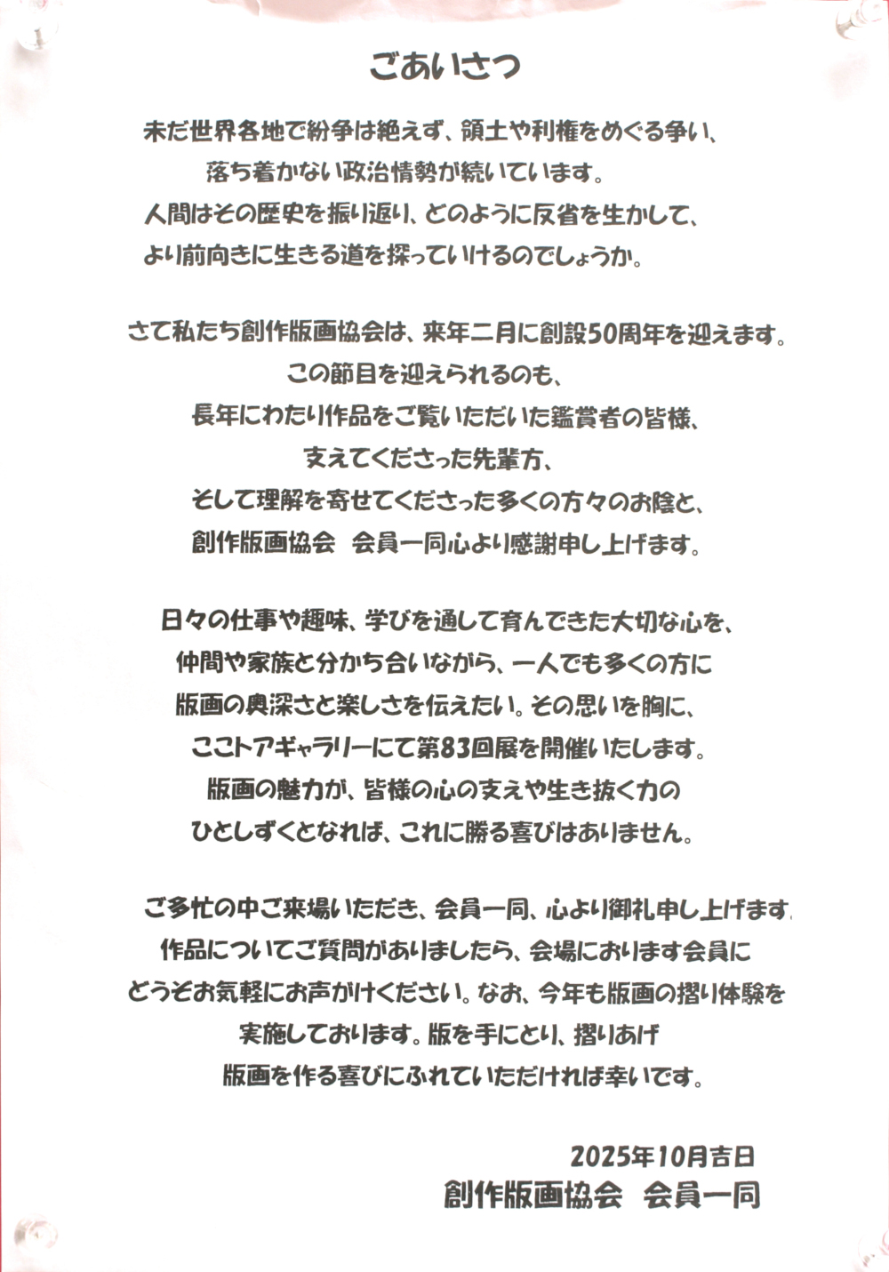 私たち創作版画協会は来年2月で、創設50周年を迎えます。永きに渡って続けて来れましたのも、多くの方々の支えあっての事と、心から御礼申し上げます。今回で83回目の創作版画協会展をトアギャラリーで開催致します。新たな会員も含め日頃から皆んなで研鑽を重ねた成果を是非、ご鑑賞下さい。今年も版画摺り体験も計画しております♪版画表現の奥深さ、楽しさを是非味わって頂けます様、願っております。創作版画協会 会員一同(25)。