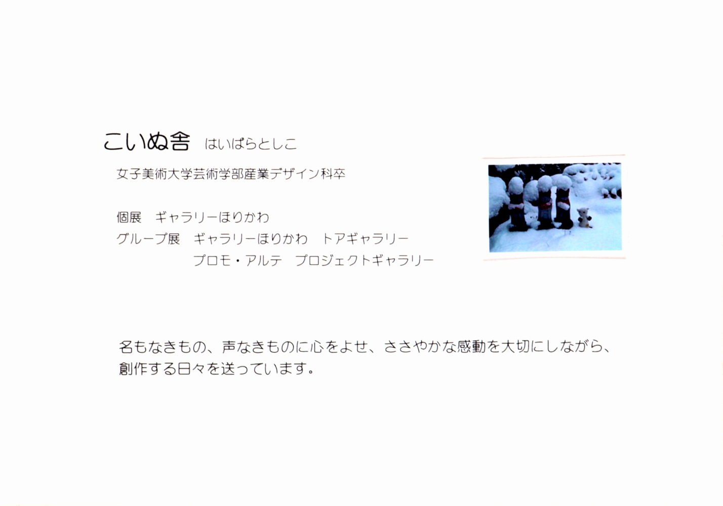 | ご記帳 1.展覧会名、2.お名前、3.ご住所 →作家様に開示 | 作品のご感想 1.展覧会名、2.お名前、3.ご住所、 4.メールかFAX、5.作品番号、6.ご感想 →作家様に開示 |