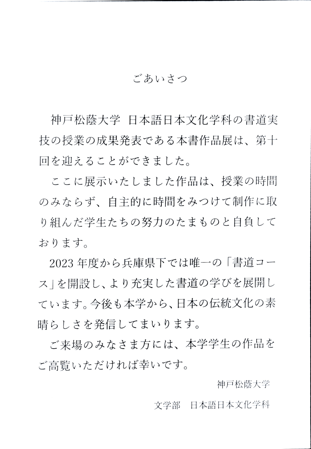 本展覧会では、神戸松蔭大学 文学部 日本語日本文化学科の書道分野に関する学びの成果を発表いたします。実技授業での作品と共に、丸山ゼミでの理論的な学びの成果も展示いたします。また、本学が主催する「第九回 高校生書道コンクール」の受賞作品も、あわせて展示もいたします。(25)。